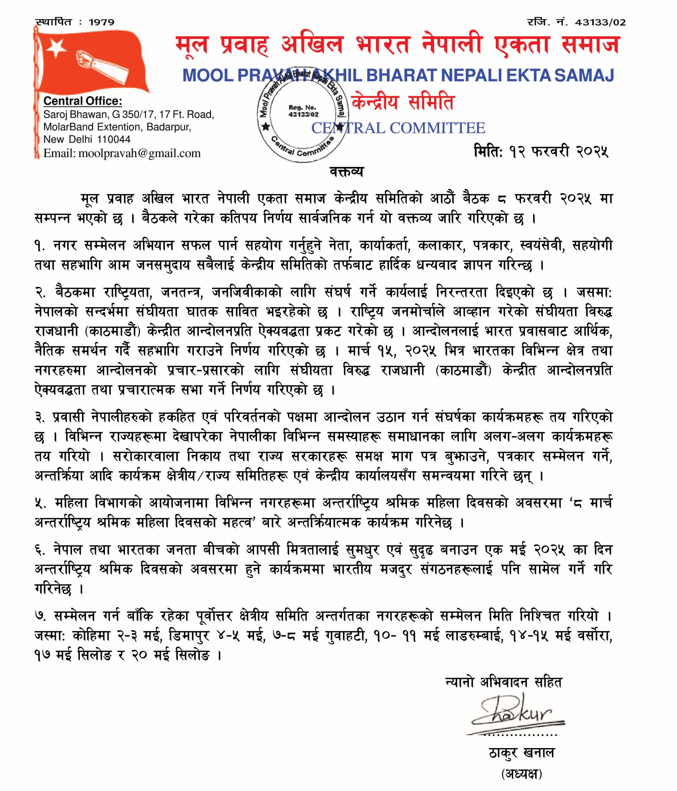 मूल प्रवाह अखिल भारत नेपाली एकता समाज केन्द्रीय समितिको आठौं बैठक ८ फरवरी २०२५ मा सम्पन्न भएको छ । बैठकले गरेका कतिपय निर्णय सार्वजनिक गर्न यो वक्तव्य जारि गरिएको छ ।