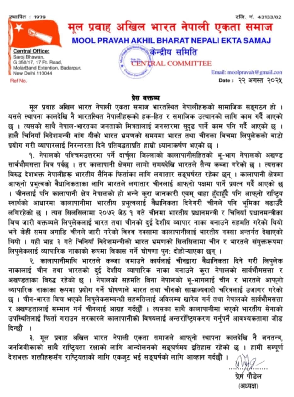 नयाँ दिल्ली । मूल प्रवाह अखिल भारत नेपाली एकता समाजले सम्पूर्ण देशभक्त शक्तिहरूसँग राष्ट्रियताको रक्षाको लागि एकजुट भई सङ्घर्षको लागि आव्हान गरेको छ ।