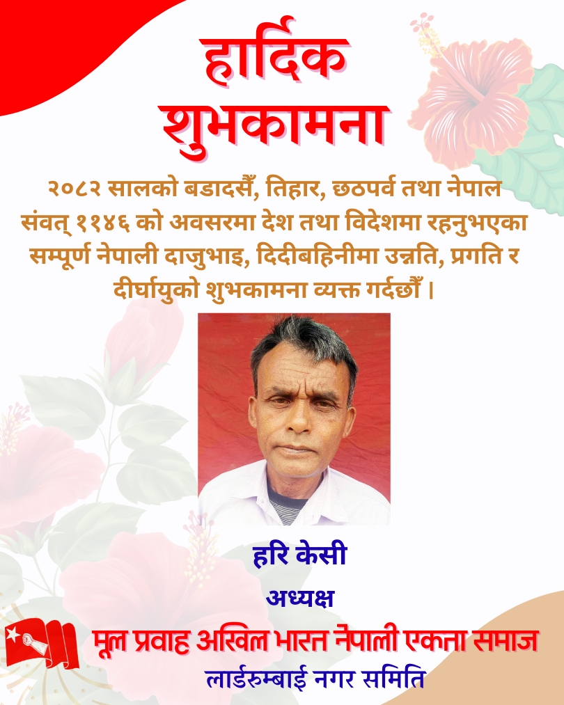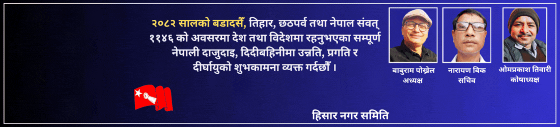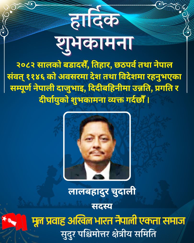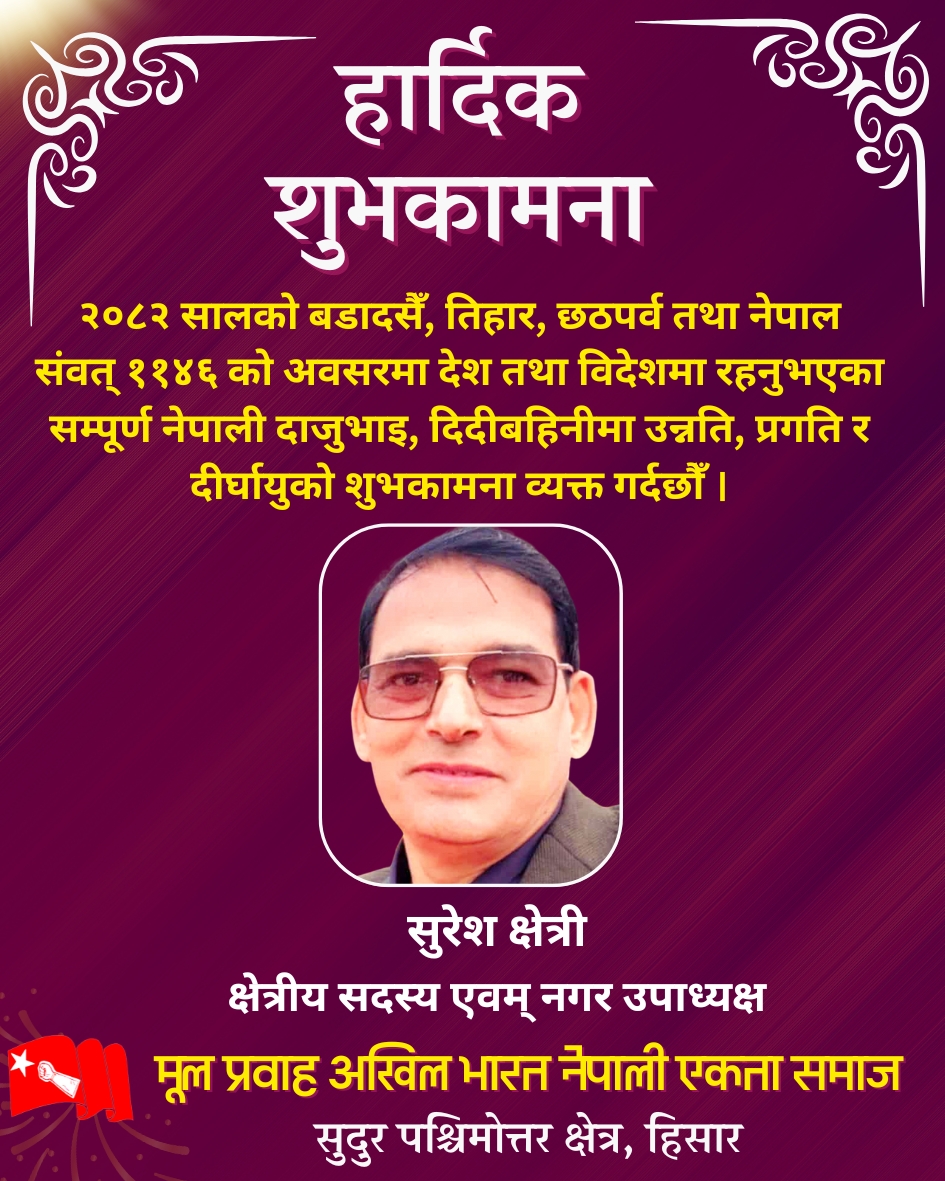 फरिदाबाद, (दिल्ली एनसिआर) 24 अक्टुबर 2025, मूल प्रवाह अखिल भारत नेपाली एकता समाज फरिदाबाद नगर समितिका कार्यकर्ता मनिराम थापाको स्वदेशमा निधन भएको छ । वहाँको निधन प्रति फरिदाबाद नगर समितिका अध्यक्ष विष्णु विसीले एक बक्तव्य जारी गर्दै श्रद्धान्जली प्रकट गर्नु भएको छ । वक्तव्यमा भनिएको छ । “मूल प्रवाह अखिल भारत...