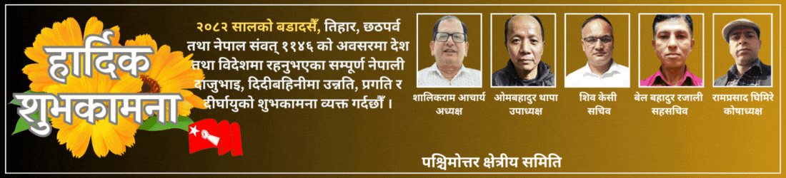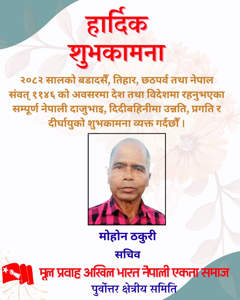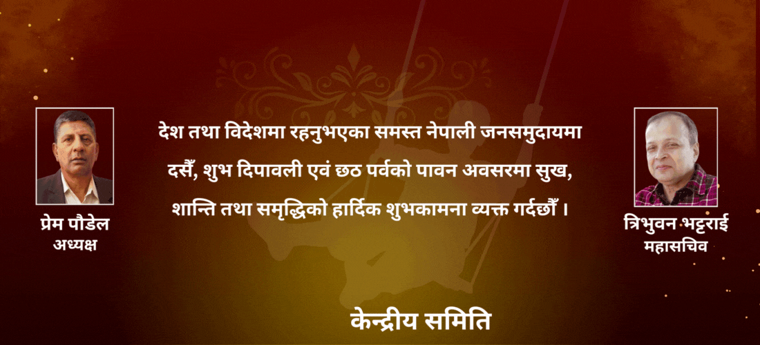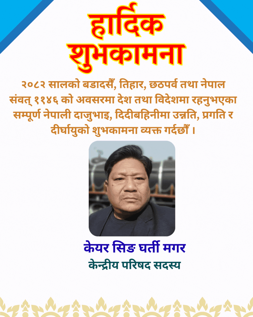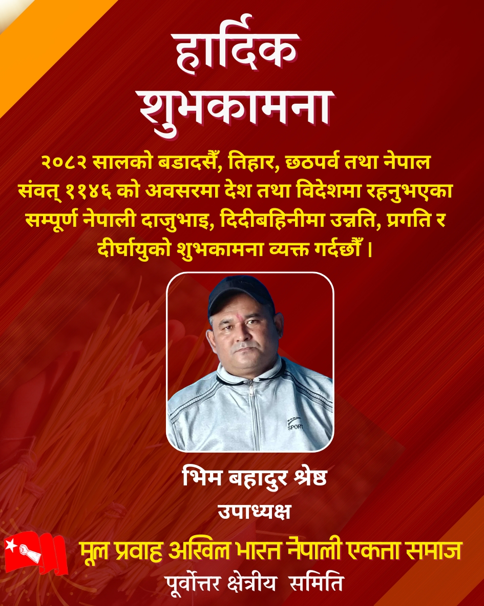 फरिदाबाद, (दिल्ली एनसिआर) 24 अक्टुबर 2025, मूल प्रवाह अखिल भारत नेपाली एकता समाज फरिदाबाद नगर समितिका कार्यकर्ता मनिराम थापाको स्वदेशमा निधन भएको छ । वहाँको निधन प्रति फरिदाबाद नगर समितिका अध्यक्ष विष्णु विसीले एक बक्तव्य जारी गर्दै श्रद्धान्जली प्रकट गर्नु भएको छ । वक्तव्यमा भनिएको छ । “मूल प्रवाह अखिल भारत...