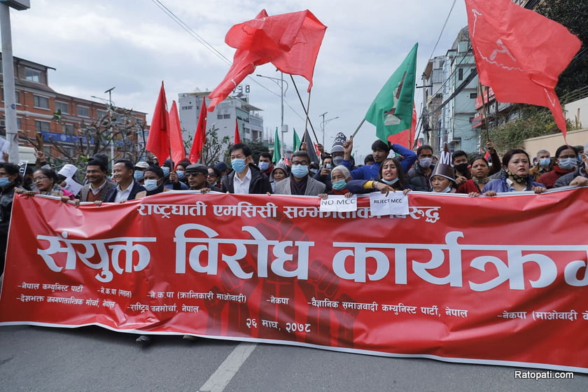 अमेरिकी सहयोग परियोजना ‘एमसीसी’ विरुद्ध काठमाडौंको माइतीघर मण्डला र बानेश्वरस्थित संसद भवन अगाडि प्रदर्शन भएको छ । ८ वटा राजनैतिक संगठनहरुले संयुक्त रुपमा प्रदर्शन गरेका हुन् । नेपाल कम्युनिष्ट पार्टी, देशभक्त जनगणतान्त्रिक मोर्चा, राष्ट्रिय जनमोर्चा, नेकपा (क्रान्तिकारी माओवादी), नेकपा र वैज्ञानिक समाजवादी कम्युनिष्ट पार्टी लगायतले प्रदर्शन गरेका छन् ।