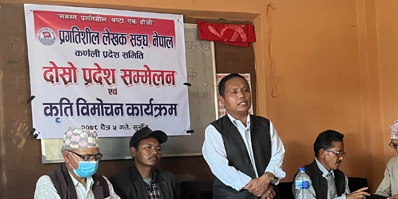 सुर्खेत । प्रगतिशील लेखक संघ नेपाल कर्णाली प्रदेश समितिको दोस्रो सम्मेलन वीरेन्द्र नगरमा सम्पन्न भएको छ । सम्मेललाई सम्बोधन गर्दै प्रगतिशील लेखक सङ्घ नेपालका केन्द्रीय सचिव एवं कणर्ाली प्रदेश इन्चार्ज प्रकाश थापा मगरले प्रलेस मार्क्सवादी विचार तथा दृष्टिकोण अनुसार समाज रूपान्तरण गर्ने अगाडि बढिरहेको साझा संस्था भएको बताएकाछन् ।