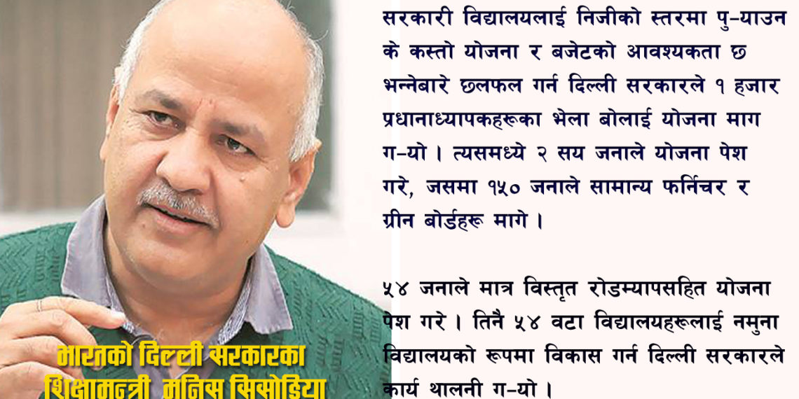 विद्यालयलाई निजीको स्तरमा पु-याउन के कस्तो योजना र बजेटको आवश्यकता छ भन्नेबारेमा छलफल गर्न दिल्ली सरकारले करिब १ हजार प्रधानाध्यापकहरूको भेला बोलाई योजना माग ग-यो । त्यसमध्ये २ सय जनाले योजना पेश गरे, जसमा १५० जनाले सामान्य फर्निचर र ग्रीन बोर्डहरू मागे । ५४ जनाले मात्र विस्तृत रोडम्यापसहित योजना पेश गरे । ती नै रोडम्यापसहित योजना पेस गरेका ५४ वटा विद्यालयहरूलाई नमुना विद्यालयको रूपमा विकास गर्न दिल्ली सरकारले कार्य थालनी ग-यो ।