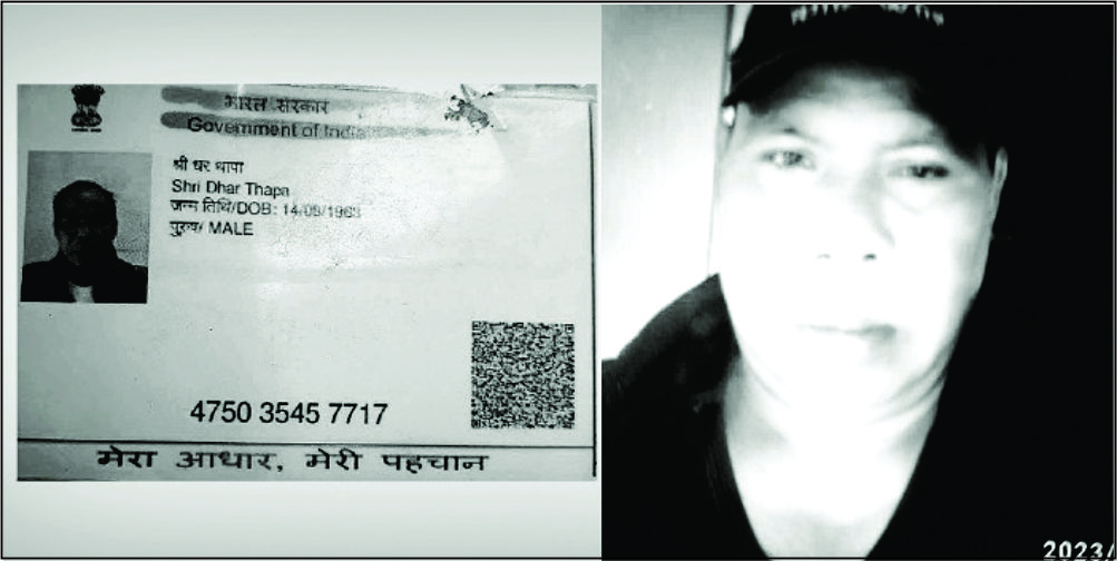 पाल्पा जिल्ला घर बताउने भारतको आधारकार्डमा तिलबहादुर थापाका छोरा श्रीधर थापा वर्ष ६१ का जनाइएका व्यक्ति डेराबसीमा अस्वस्थ भएपछि छिमेकीहरूले जुलाई २, २०२३ को दिउसो अस्पताल पुर्‍याएका थिए ।