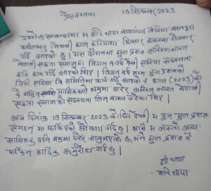 हिसार, १९ सेप्टेम्बर । मूल प्रवाह अखिल भारत नेपाली एकता समाजको नीति, सिद्धान्त, अनुशासनलाई तिलान्जली दिएर केहि समय पहिला कतिपय महत्वाकांक्षी व्यक्तिहरुले कथित अखिल भारत नेपाली एकता समाजको नाम लिएर हिसार नगर समिति गठन गरेका थिए । उनीहरुको ‘कथित एकता समाज’को नगर समितिका कोषाध्यक्ष रुपेश बराम र नगर सदस्य हरि थापाले सो संगठन परित्याग गरि १९ सेप्टेम्बर २०२३ को मंगलबार मूल प्रवाह अखिल भारत नेपाली एकता समाजमा प्रवेश गर्नुभएको छ ।