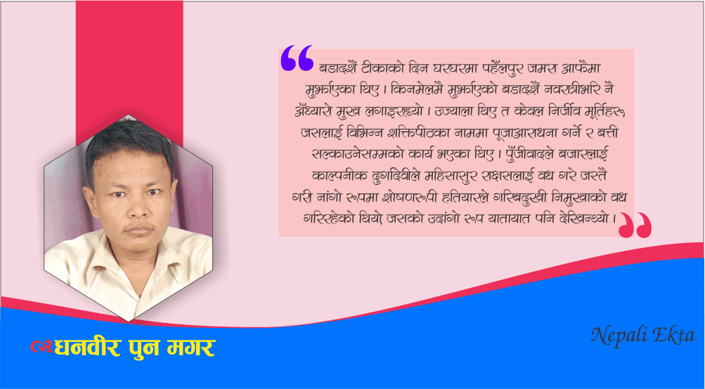 बडादसैँ टीकाको दिन घरघरमा पहेँलपुर जमरा आफैमा मुर्झाएका थिए । किनमेलमै मुर्झाएको बडादसैँ नवरात्रीभरि नै अँध्यारो मुख लगाइरह्यो । उज्याला थिए त केवल निर्जीव मूर्तिहरू, जसलाई विभिन्न शक्तिपीठका नाममा पूजाआराधना गर्ने र बत्ती सल्काउनेसम्मको कार्य भएका थिए । यसको मुख्य कारण थियो पुँजीवाद । पुँजीवादले बजारलाई काल्पनीक दुर्गादेवीले महिसासुर राक्षसलाई वध गरे जस्तै गरी नाङ्गो रूपमा शोषणरूपी हतियारले गरिबदुखी, निमुखाको वध गरिरहेको थियो, जसको उदाङ्गो रूप यातायात पनि देखिन्थ्यो ।