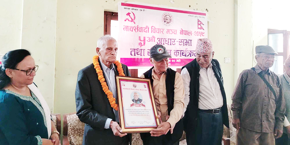 बुटवल । मार्क्सवादी बिचार मञ्च नेपालले नेकपा (मसाल)का महामन्त्री मोहनबिक्रम सिंहलाइ सम्मान गरेको छ । साथै अर्का कम्युनिष्ट नेता गोपिरमण उपाध्यालाई पनि मञ्चले सम्मान गरेको थियो ।