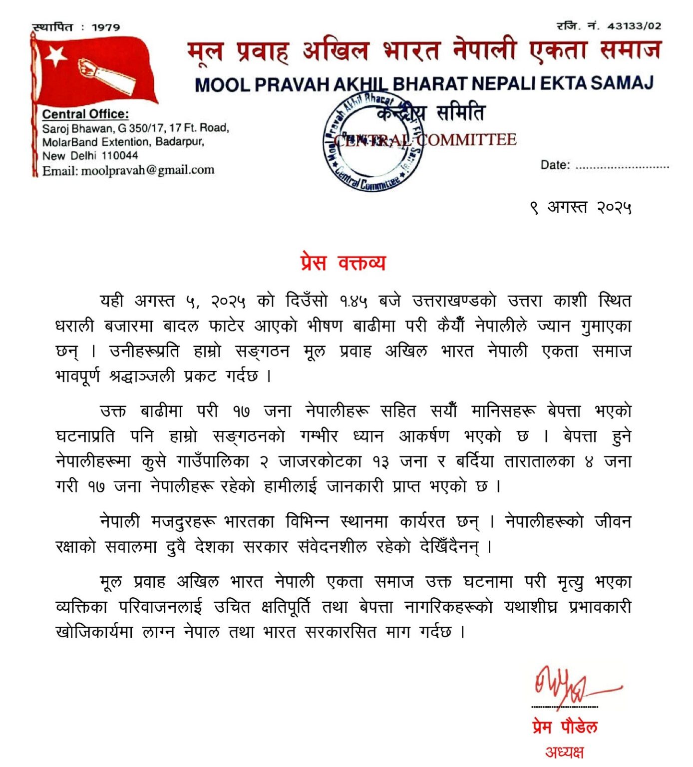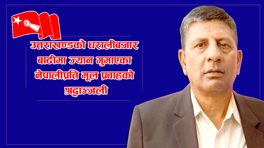 नयाँदिल्ली । उत्तराखण्डको धरालीबजारमा भारी वर्षापछि आएको बाढीमा परी ज्यान गुमाएका नेपालीप्रति मूल प्रवाह अखिल भारत नेपाली एकता समाजले श्रद्धाञ्जली व्यक्त गरेको छ ।
