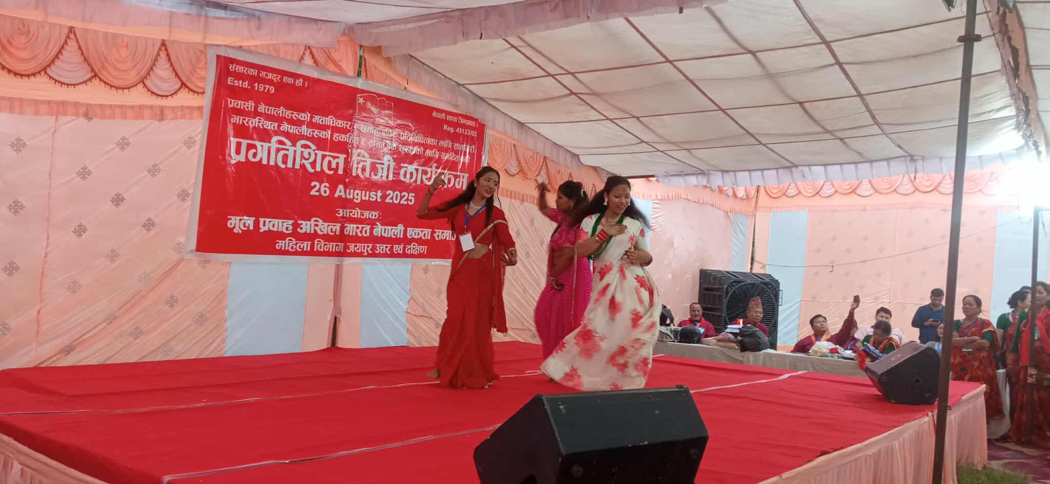 जयपुर, 26 अगस्त 2025, मूल प्रवाह अखिल भारत नेपाली एकता समाज जयपुर उत्तर एवं दक्षिण नगर महिला विभागले संयुक्त तिजी कार्यक्रम सम्पन्न गरेको छ । २६ अगस्त २०२५ का दिन दुवै नगरका महिला विभागको संयुक्त आयोजनमा सो प्रगतिशील तिजी कार्यक्रम सम्पन्न भएको हो ।