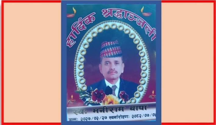 वक्तव्यमा भनिएको छ । “मूल प्रवाह अखिल भारत नेपाली एकता समाज, फरीदाबाद नगर समितिका सक्रिय र इमानदार नगर सदस्य स्व. मनिराम थापा जीको असामयिक निधनले सम्पूर्ण नेपाली समाज शोकाकुल बनेको छ।