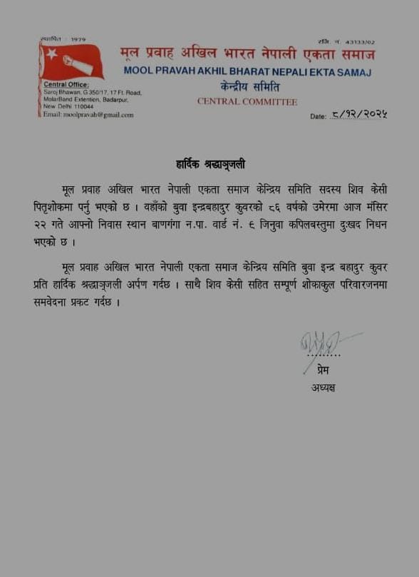 मूल प्रवाह अखिल भारत नेपाली ,कता समाज केन्द्रिय अध्यक्ष प्रेम पौडेल र पश्चिमोत्तर क्षेत्रीय समिति अध्यक्ष शालिकराम आर्चायले छुट्टा छुट्टै वक्तव्य पारि गर्दै बुवा इन्द्र बहादुर कुवर प्रति हार्दिक श्रद्धान्जली शिव केसी सहित सम्पूर्ण शोकाकुल परिवारजनमा समवेदना प्रकट गर्नुभएको  छ ।