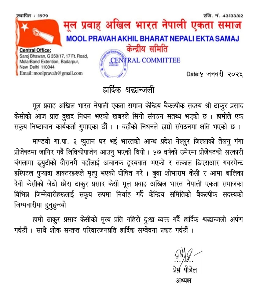मूल प्रवाह अखिल भारत नेपाली एकता समाज केन्द्रिय बैकल्पीक सदस्य श्री ठाकुर प्रसाद केसीको आज प्रात दुखद निधन भएको छ । केन्द्रिय अध्यक्ष प्रेम पौडेलले वहाँ निधन प्रति गहिरो दुःख प्रकट गदै वहाँको खबरले सिंगो संगठन सतब्ध भएको र संगठनले एउटा सकृय निष्ठावान कार्यकर्ता गुमाएको भन्दै श्रद्धान्जली अर्पण गरिनुका साथै शोक सन्तप्त परिवारजनप्रति हार्दिक सम्वेदना प्रकट गर्नु भएको छ ।