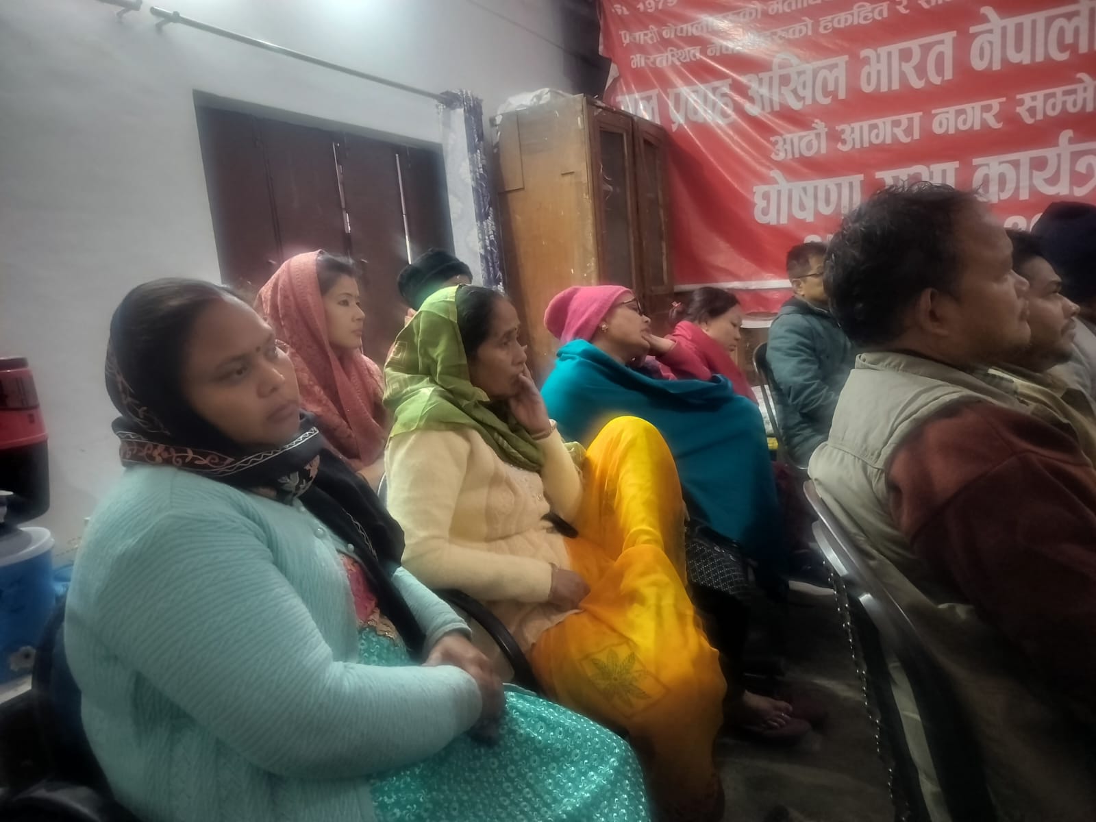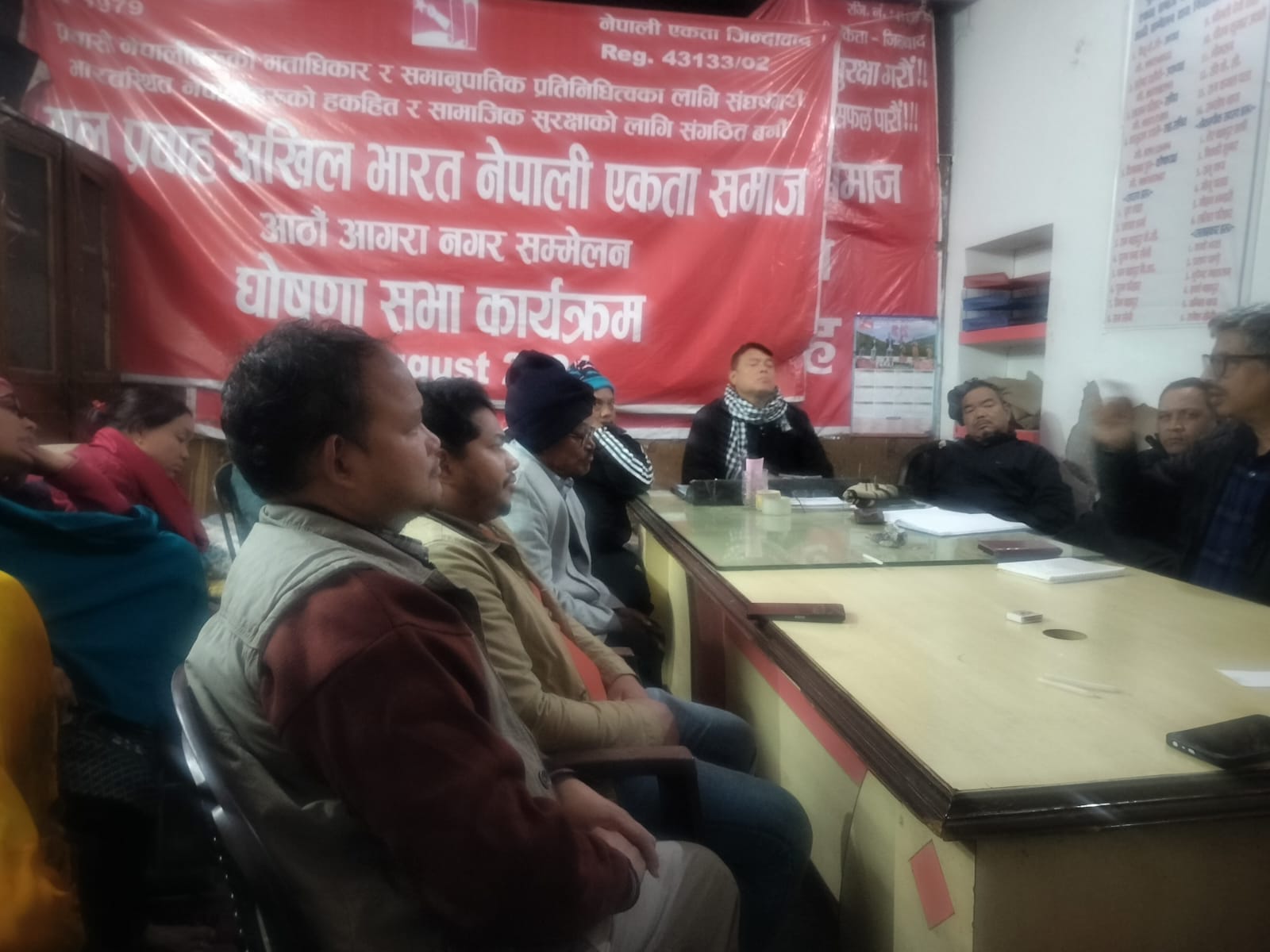मूल प्रवाह अखिल भारत नेपाली एकता समाज आगरा नगर समिति भित्र सकृय अगुवा कार्यकर्ताहरूको प्रशिक्षण कार्यक्रम सम्पन्न भएको छ । आगरा नगर समितिको कार्यालयमा सम्पन्न कार्यक्रमको भएको थियो । अध्यक्ष मिठ्ठु केसीको अध्यक्षता र सचिव लाखन परियारको संचालनमा अगाडी बढेको उक्त कार्यक्रममा निवर्तमान अध्यक्ष तथा केन्द्रिय सल्लाकार ठाकुर खनाल, उपाध्यक्ष कपिल खनाल केन्द्रिय सदस्य धुर्व शाहको विषेश उपस्थिती रहेको थियो । ज्ञात अज्ञात शहिदहरू प्रति एक तिनेटको मौन धारण पछि सहभागीहरूलाई नगर समितिका सदस्य राम बहादुर केसीले स्वागत गर्नु भएको थियो ।