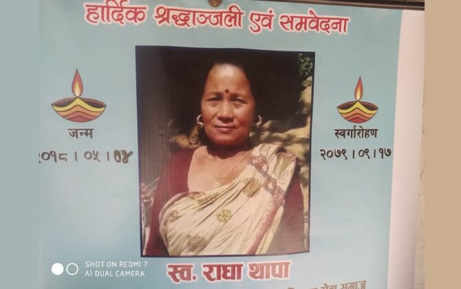 सन्धिखर्क । राष्ट्रिय जनमोर्चा, अर्घाखाँचीले पार्टीका सदस्य राधा थापाप्रति श्रद्धाञ्जली अर्पण गरेको छ । शितगंगा नगरपालिका १० सिद्धारामा शोक सभा आयोजना गरी राजमोले उहाँप्रति श्रद्धाञ्जली अर्पण गरेको हो । राष्ट्रिय जनमोर्चा जिल्ला सदस्य गोविन्द थापाकी आमा...