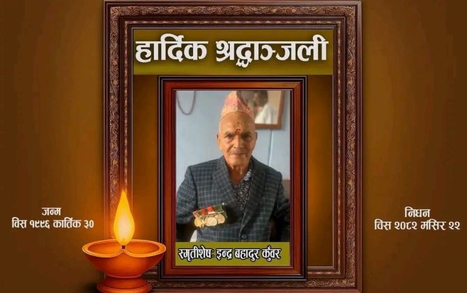 पुरा पढ्नुहोसनई दिल्ली, 4 दिसेम्बर 2025, मूल प्रवाह अखिल भारत नेपाली एकता समाजका पूर्व महासचिव कुल बहादुर थापा कि पत्नी एवं महिला नेत्री नन्दकला थापा (देवी थापा)को उपचारकै क्रममा पोखरा स्थित मणीपाल हस्पिटलमा 2082 मंरिस 18...